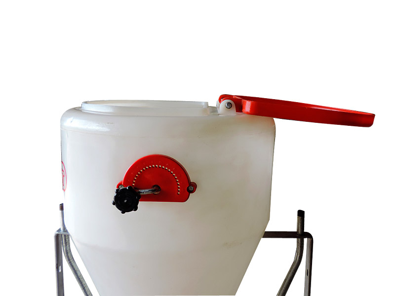 Polietileno de alta densidad con protección UV y acero inoxidable. Sencillo sistema funcional para fácil limpieza y desinfección. Permite regular el flujo de la ración de alimento y lo distribuye uniformemente.